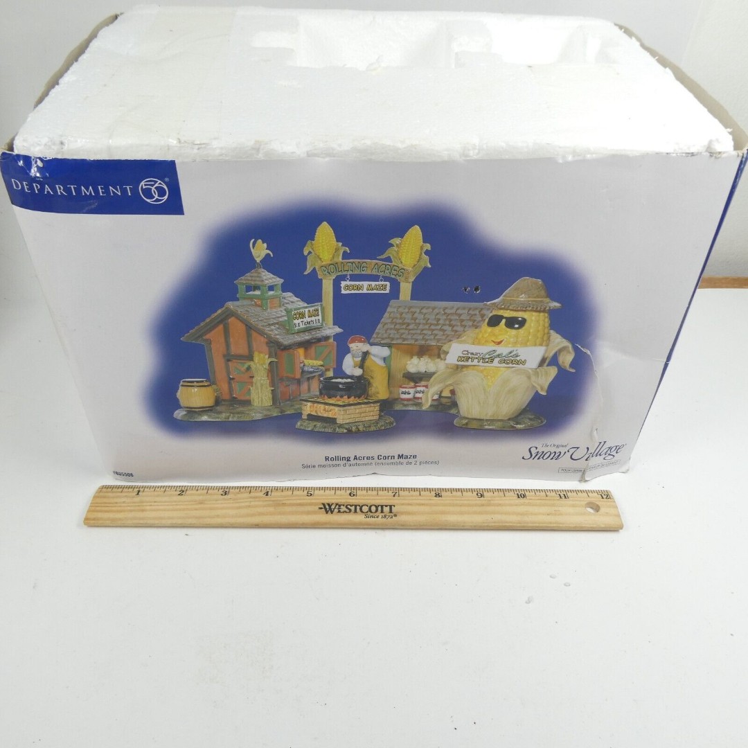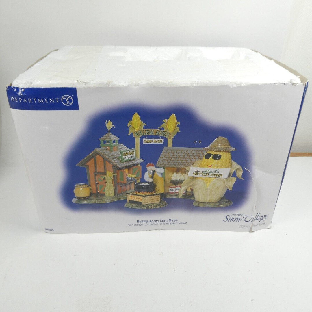 Rolling Acres Corn Maze by Department 56, part of the Snow Village collection. Note that it is MISSING the accessory figurine (man with cauldron). The corn maze sculpture itself is in nice shape overall, the only damage I see is that the ear of corn that adorns the peak on the roof has been broken/bent. This sculpture comes in the original box; box shows some storage wear.