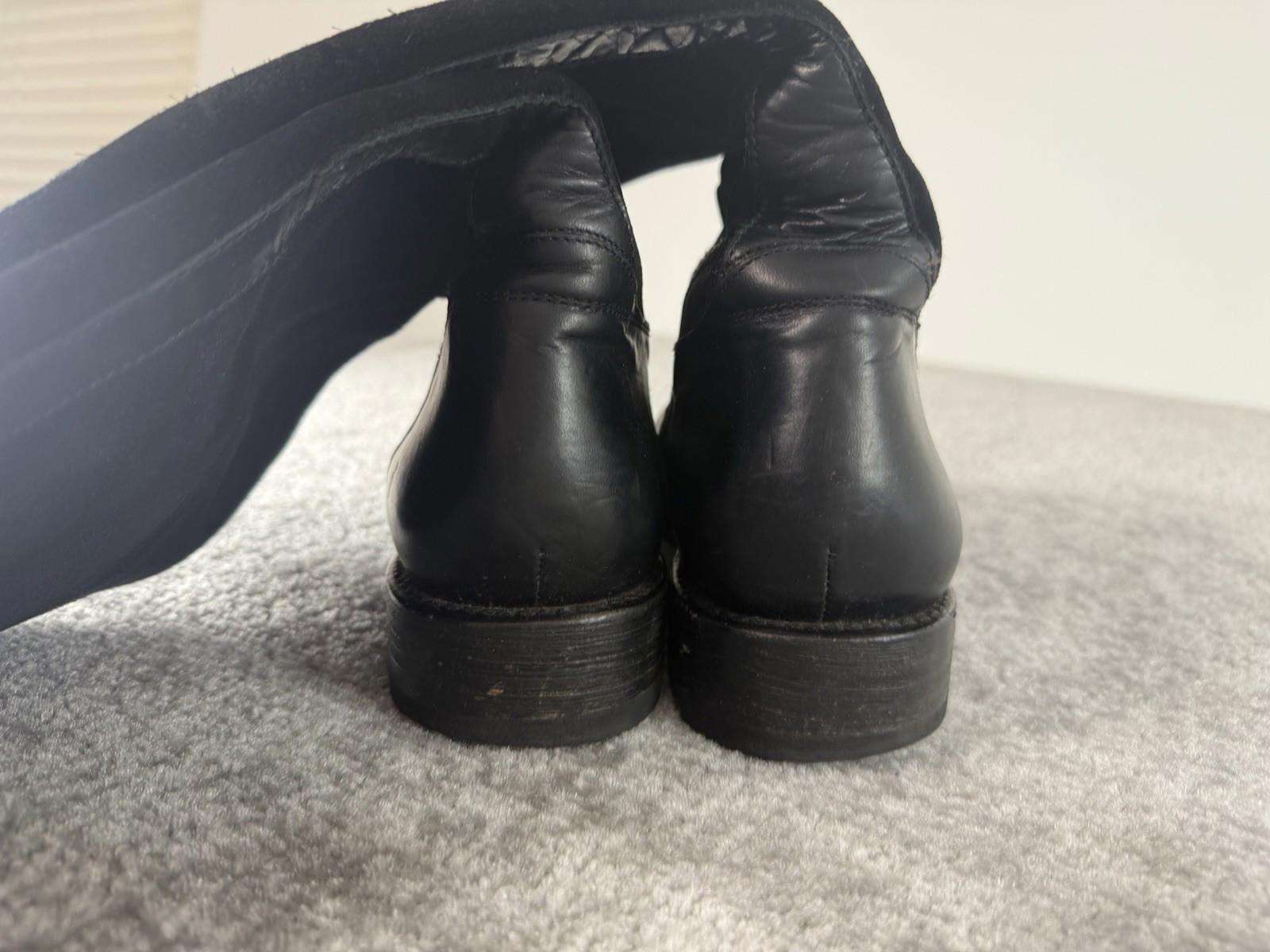 Beautiful tall Frye boots made of soft black leather and suede with the signature button detail. Side zipper for easy on/off.
