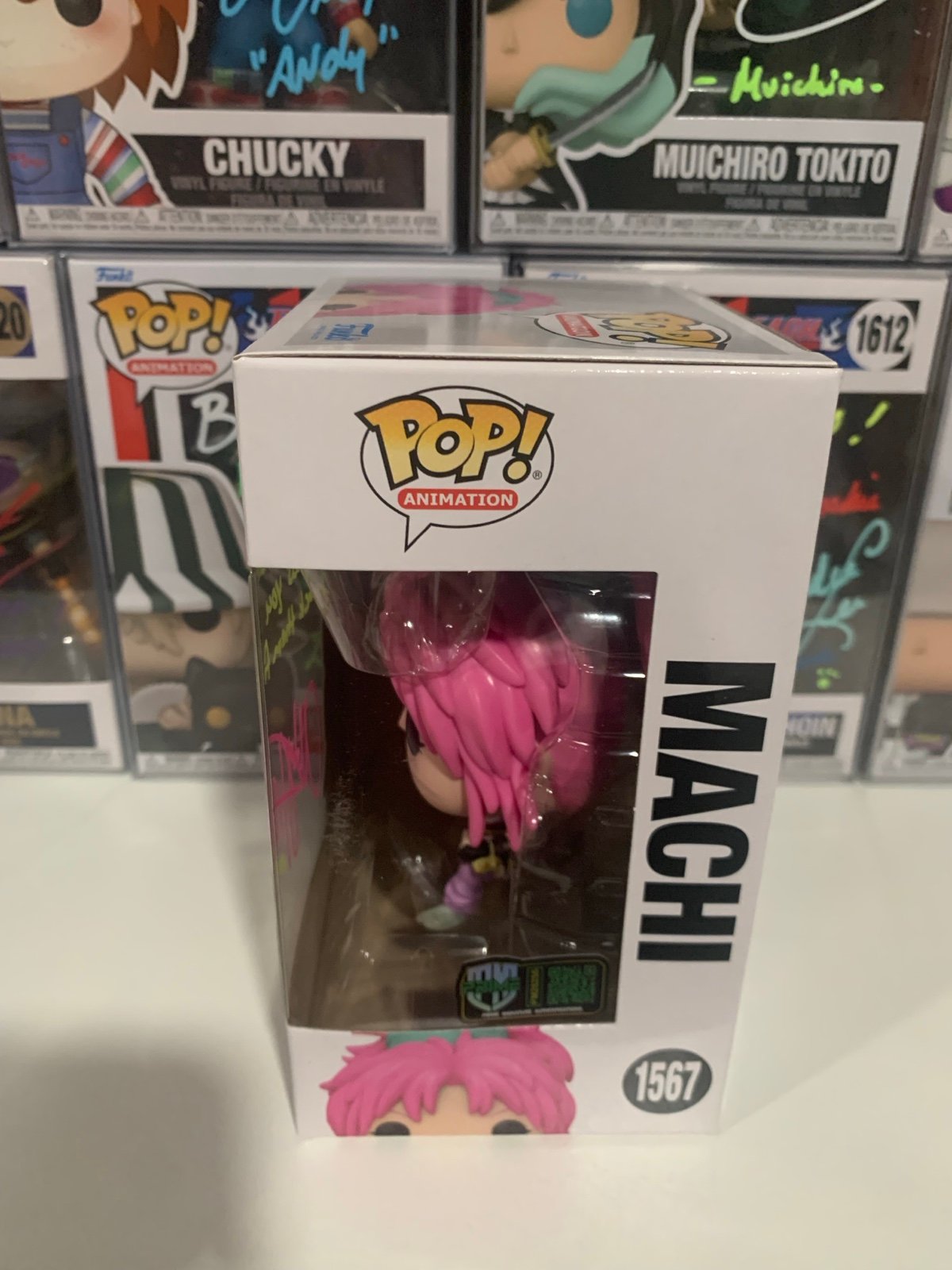 The product is a Hunter X Hunter anime Machi #1567 Funko Pop vinyl figure signed by Abby Trott. This exclusive item is from Funko's Animation collection and is autographed in hard-signed format. The figure comes with a soft protector and is a highly collectible piece perfect for fans of the Hunter X Hunter franchise. The autograph adds a unique touch to this limited edition Funko Pop, making it a valuable addition to any animation-themed collection.